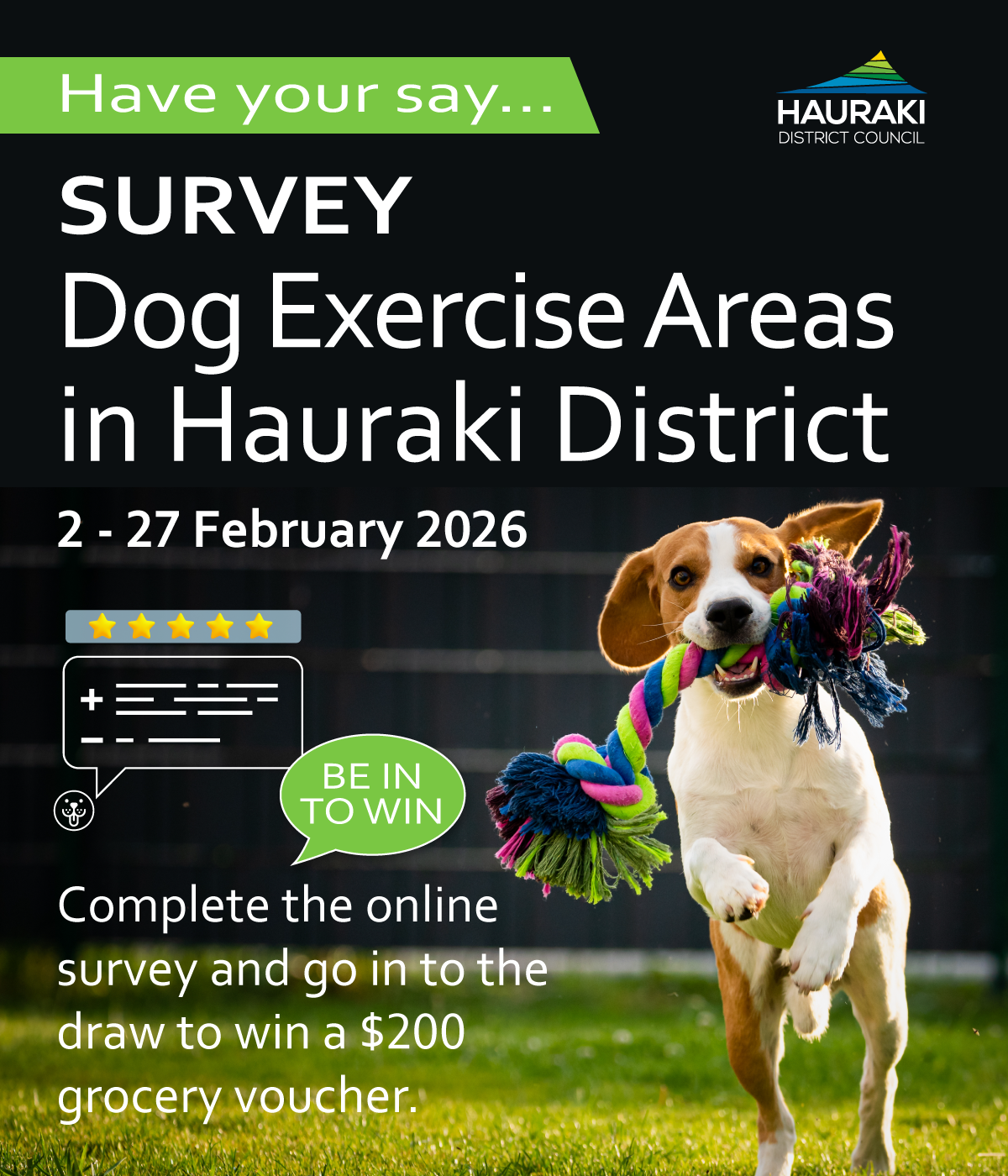 We are checking in with our dog owners if we are meeting their needs with our dog exercise areas! Go in the draw to win one of three $200 grocer vouchers by giving us your feedback.