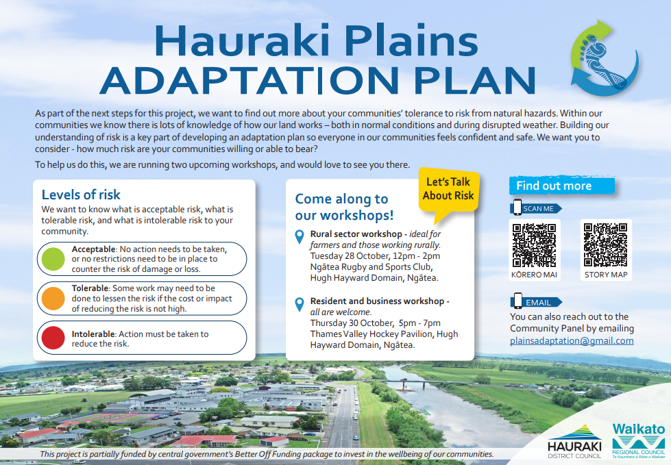 As part of the next steps for the Hauraki Plains Adaptation Planning project, we want to find out more about our communities’ tolerance to risk from natural hazards. Within our communities we know there is lots of knowledge of how our land works – both in normal conditions and during disrupted weather. Building our understanding of risk is a key part of developing an adaptation plan so everyone in our communities feels confident and safe.