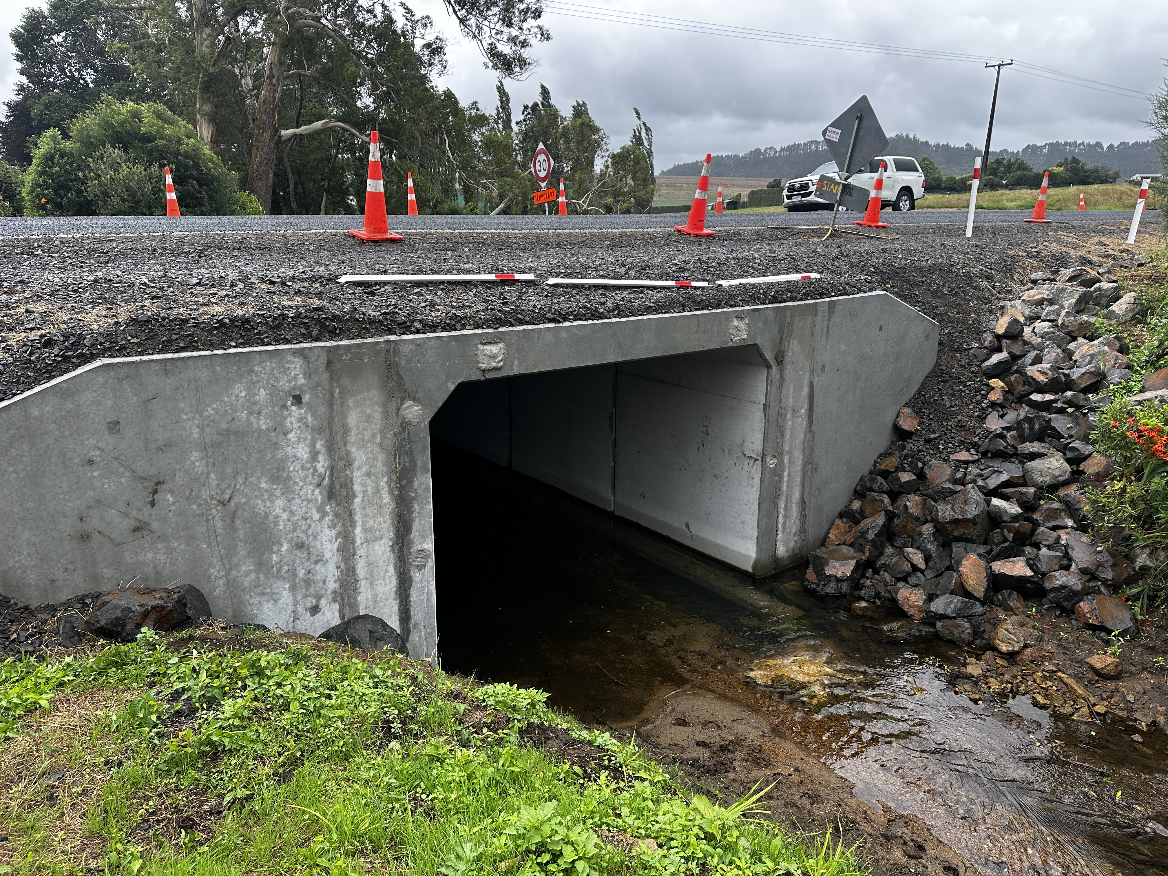 At the same time, we are also replacing an old, corroded culvert, located on Trig Road North around 250m from the Waihi Beach Road intersection. Its replacement will be a new, stronger concrete culvert that ensures the long-term safety and stability of the road. As this culvert carries a tributary of the Ohinemuri River, the stream will need to be temporarily diverted to replace the old culvert with the new one.